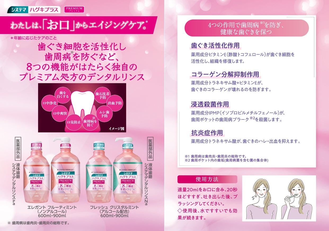 ライオン株式会社(代表取締役兼社長執行役員:竹森 征之)は、年齢にともない気になる歯周病(※1)の予防や、お口の様々な気になりごとを8つまとめてケアする『システマ ハグキプラス プレミアム』を2024年9月にリニューアルいたしました。年齢にともなうお口の変化に応じたケア習慣「お口のエイジングケア(※2)」を新たに提案する取り組みの一環として、2024年10月1日(火)より富士フイルム株式会社(本社:東京都港区)が展開する『アスタリフト ザ セラム リンクルリペア』との店頭やSNS等を活用したタイアップを開始いたします。