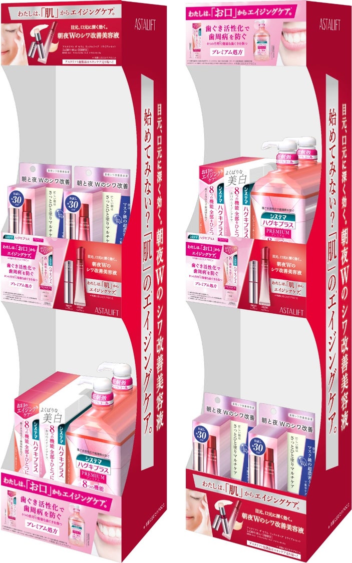 『システマ ハグキプラス プレミアム』は、「お口のエイジングケア(※2)」として、年齢に伴い気になる歯周病(※1)の予防など、お口の様々な気になりごとをまとめてケアする新習慣を提案しています。そしてこの度、“信じられる明日の肌へ”をスローガンとして掲げる、エイジングケア(※2)を目的としたスキンケアブランド『ASTALIFT』のシワ改善美容液『アスタリフト ザ セラム リンクルリペア(医薬部外品)』とのタイアップを実施いたします。お口とお肌、それぞれのエイジングケア習慣を通じて、より一層前向きな気持ちで明日を迎えられる人を増やしていきたい、という双方の想いが合致し、タイアップが実現しました。