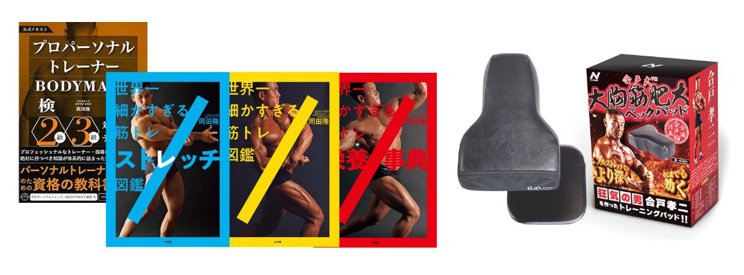 ストレッチをより効かせトレーニング効果を高める、ジムガレージでも取り扱い中の大ヒット商品「合戸式大胸筋肥大パッド」と、バズーカ岡田サイン入り著書「プロパーソナルトレーナーBODYMAKE検定」&「世界一細かすぎる3シリーズ」の豪華セットです。