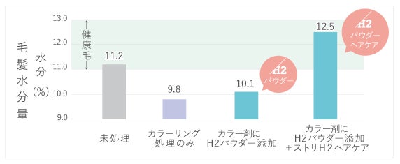 ヘアカラーをする事によって髪の水分量は11.2%→9.8%に減少します。しかし、弊社のH2パウダー(カラー剤に混ぜて使用するもの)を使用することで、水分補給をしながらダメージレスに施術ができ、更にヘアケアシリーズ(シャンプー・トリートメント・カプセル美容液)を併用していただくことで、さらに水分量が上がる【髪の水分量が12.5%まで改善(元の髪の状態よりも向上)する】という驚きと嬉しい結果が出ました♥//