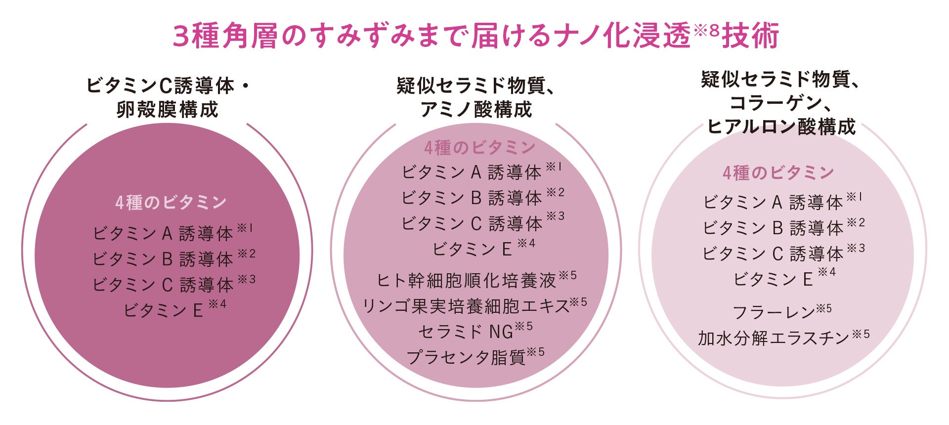※6 3種の独自ナノカプセル(1)【4種ビタミン(ビタミン誘導体、ビタミンB6誘導体、ビタミンC誘導体、ビタミンE)を弊社独自原料Funcos C-IS(インステアリルアスコルビルリン酸2Na)と加水分解卵殻膜で含有させたナノカプセル】、(2)【4種ビタミン(ビタミンA誘導体、ビタミンB6誘導体、ビタミンC誘導体、ビタミンE)、プラセンタ脂質、セラミドNG、ステロール類、ヒト幹細胞順化培養液、リンゴ果実培養細胞エキスを疑似セラミド物質とジラウラミドグルタミドリシンNaで含有させたナノカプセル】、(3)【4種ビタミン(ビタミン誘導体、ビタミンB6誘導体、ビタミンC誘導体、ビタミンE)、フラーレン、加水分解エラスチンを、ココイル加水分解コラーゲンK、イソステアロイル加水分解コラーゲンAMPD、加水分解ヒアルロン酸アルキル(C12-13)グリセリル、疑似セラミド物質で含有させたナノカプセル】を開発し、その独自ナノカプセル3種類と加水分解カイメンを合わせて配合したクリーム処方として日本初(2024年6月当社調べ)