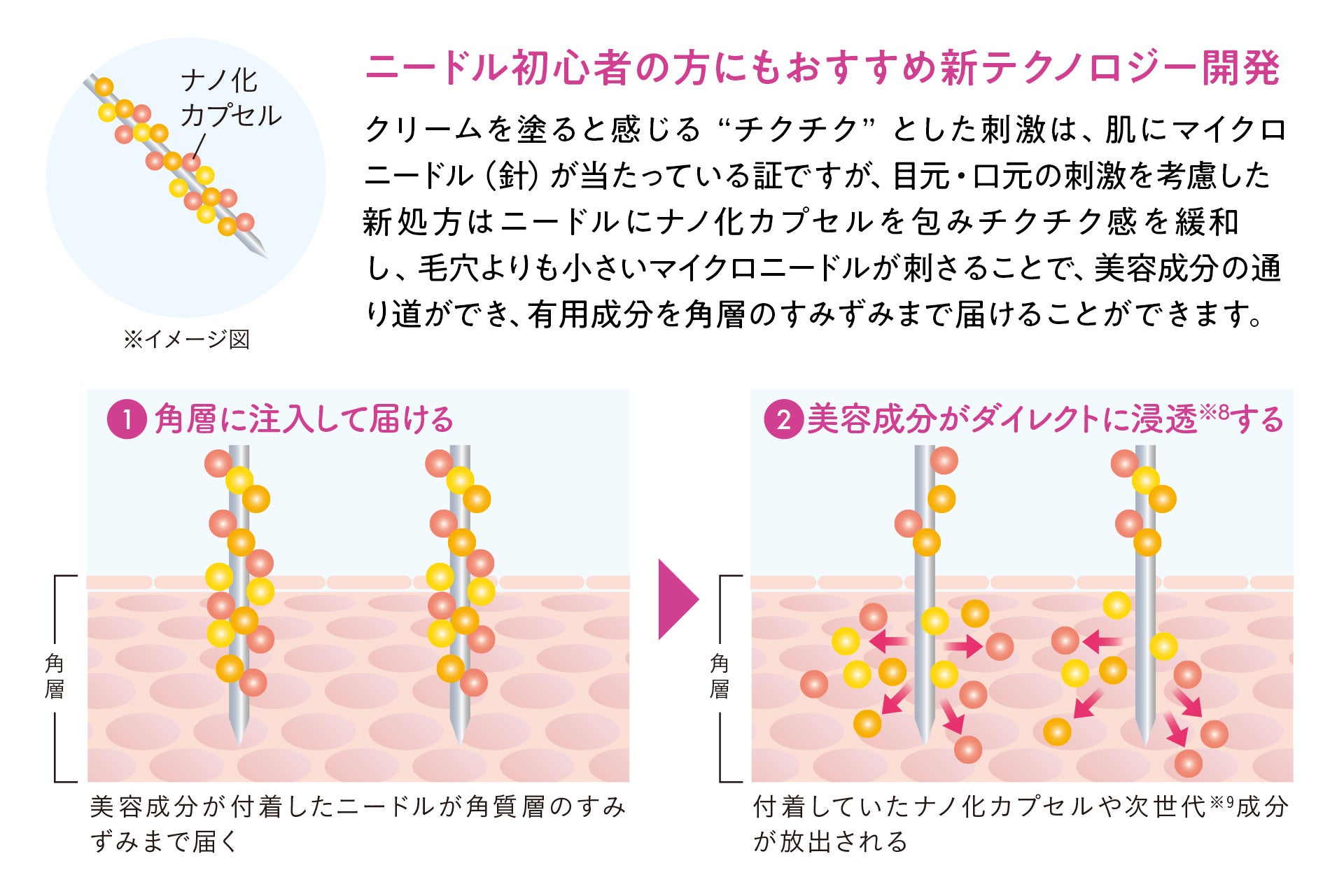 ニードルにナノ化カプセルを包む新処方は、チクチク感を緩和し、有用成分を浸透※8させる新処方。