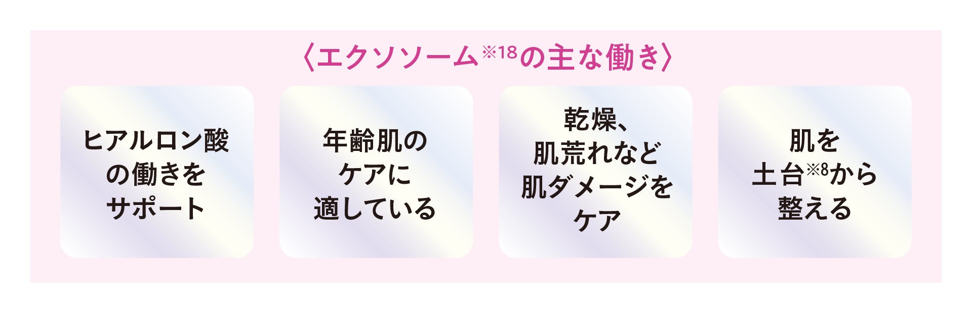 「エクソソーム※18」はもともと人間の肌細胞の中にある成分のひとつで、有用成分を豊富に含んだ次世代※9成分。年齢肌に不足している成分を補えるだけではなく、肌環境をすこやかに整えることで、年齢サイン※17の気にならない肌へと整えます。