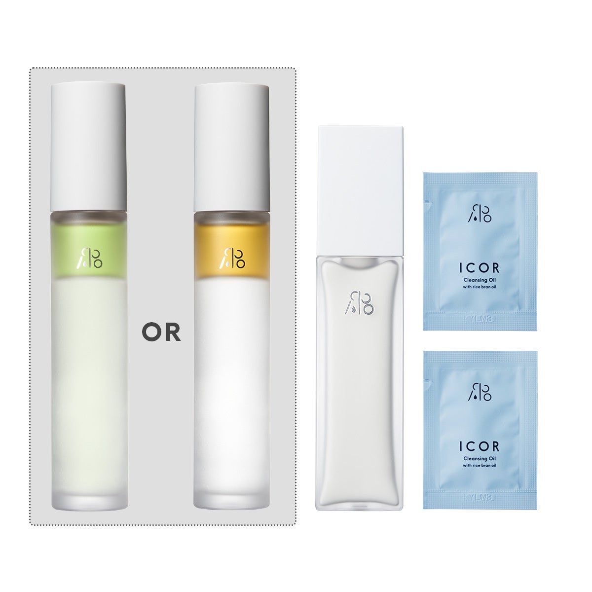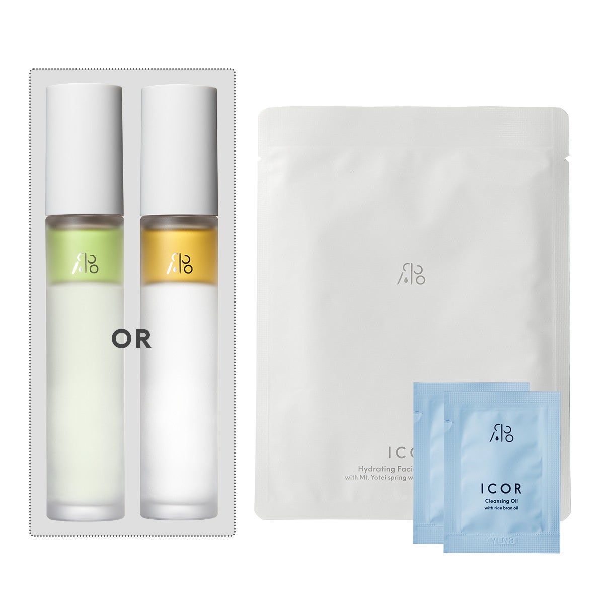 ICORで人気No.1 アイテムの明るく幸福感を感じる柑橘の爽やかな甘さとスパイシーな香りが魅力的な「オイルインミスト」と、北海道の代表的なフルーツであるメロン種子油を使用したヴィーガンで大人ラグジュアリーな香りが特徴の新商品「MELONオイルインミスト」のどちらか一本と、純米酒(コメ発酵液)がすっきりと肌を潤す「Sake フェイシャルマスク」、さらに「オイルクレンジング」のミニパウチが2個付いた限定キット 。オイルと美容液の2層式で保湿するミストと、特別な日に使いたい贅沢なトリートメントマスクのセットで、潤い集中チャージを。