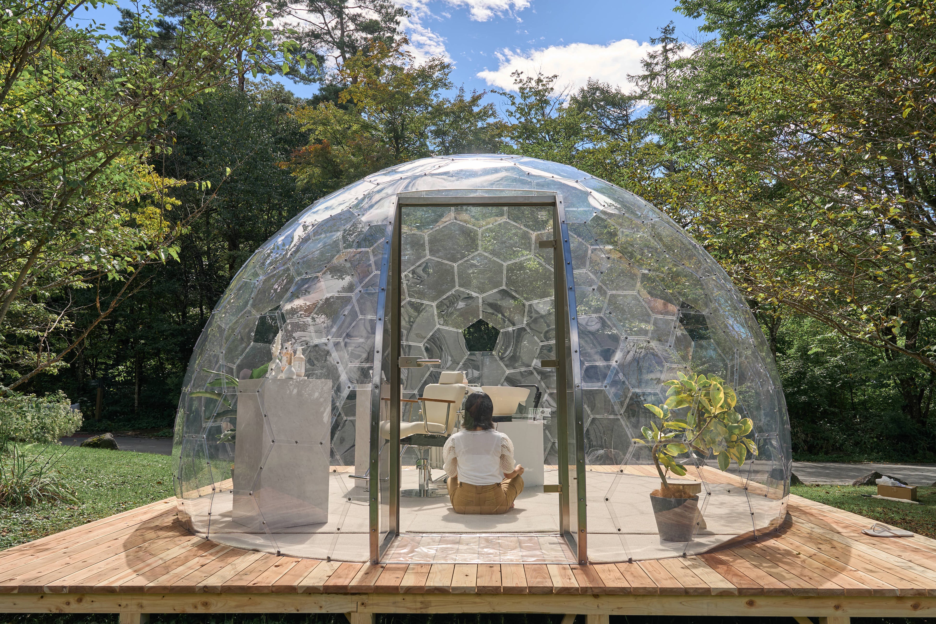 Care me(ケアミー)】の世界観と香りを深く体験いただくために、軽井沢 星野温泉トンボの湯 の豊かな自然の中にクリアドームを設置。