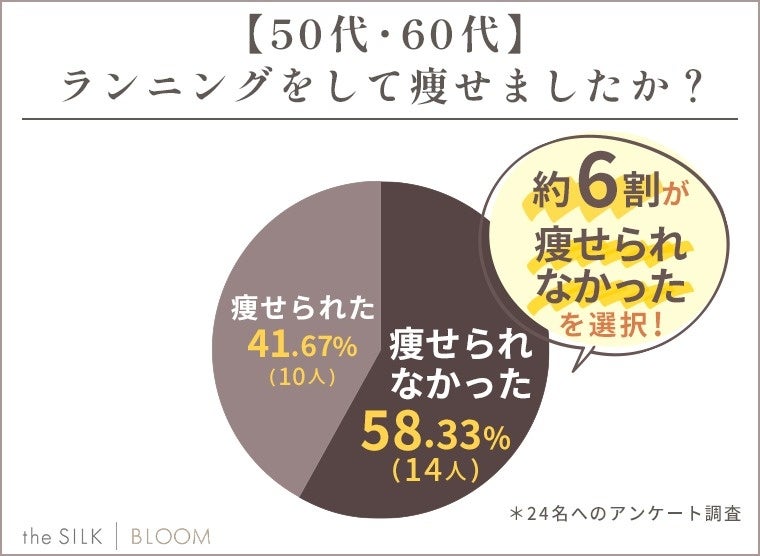 50・60代にランニングで痩せられたか調査したところ、「痩せられなかった」と答えた方が約58%と多い傾向でした。