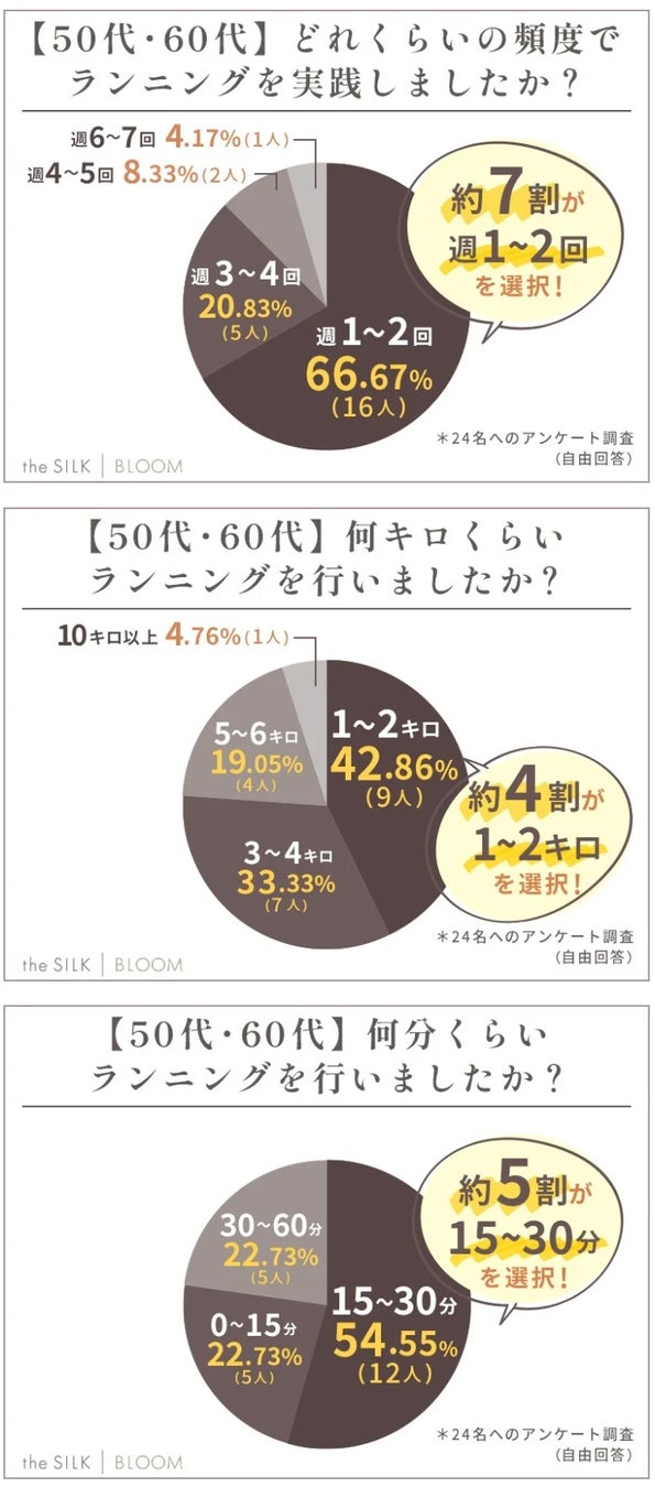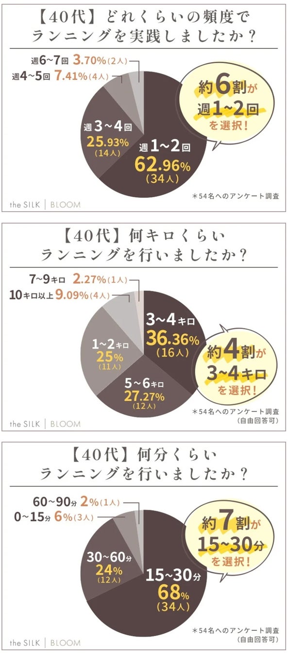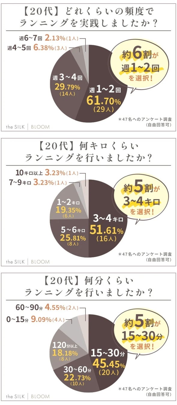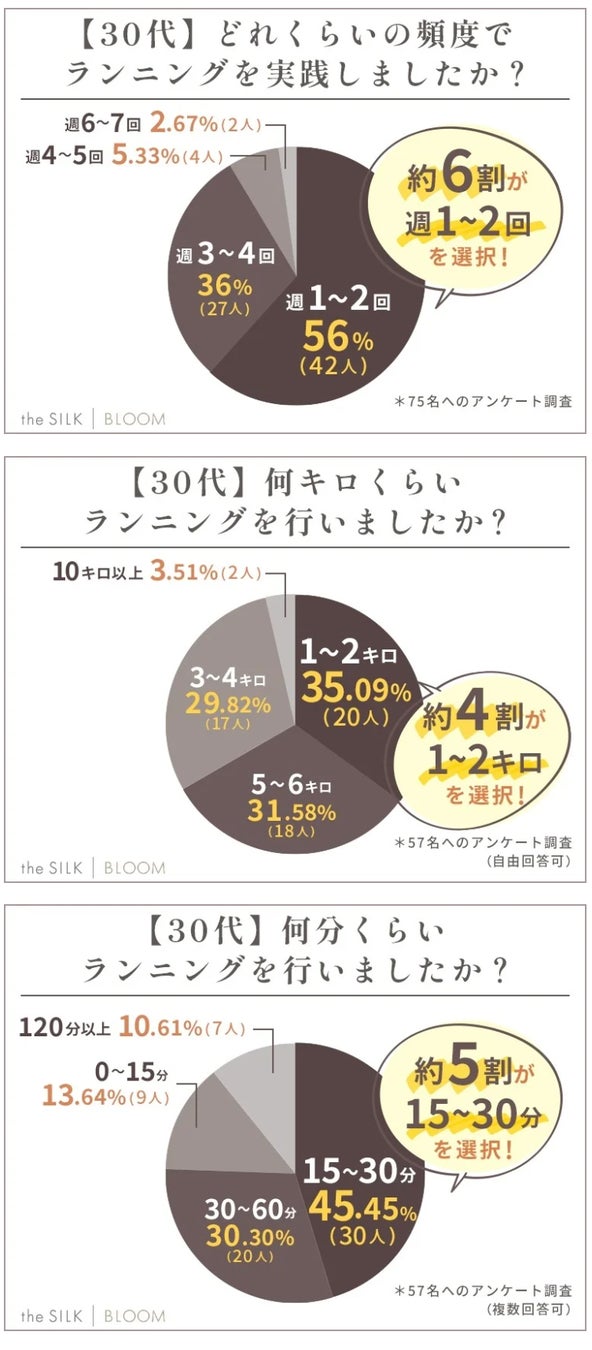 また「週に何回・何キロ・何分くらいランニングをしていたか」を調査したところ、「週1~2回・3~4キロ・15~30分行った」と答えた方が半数近くという結果に。