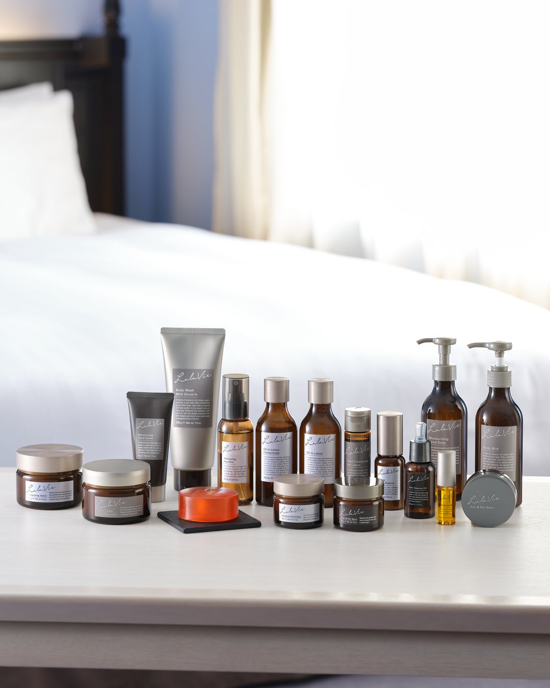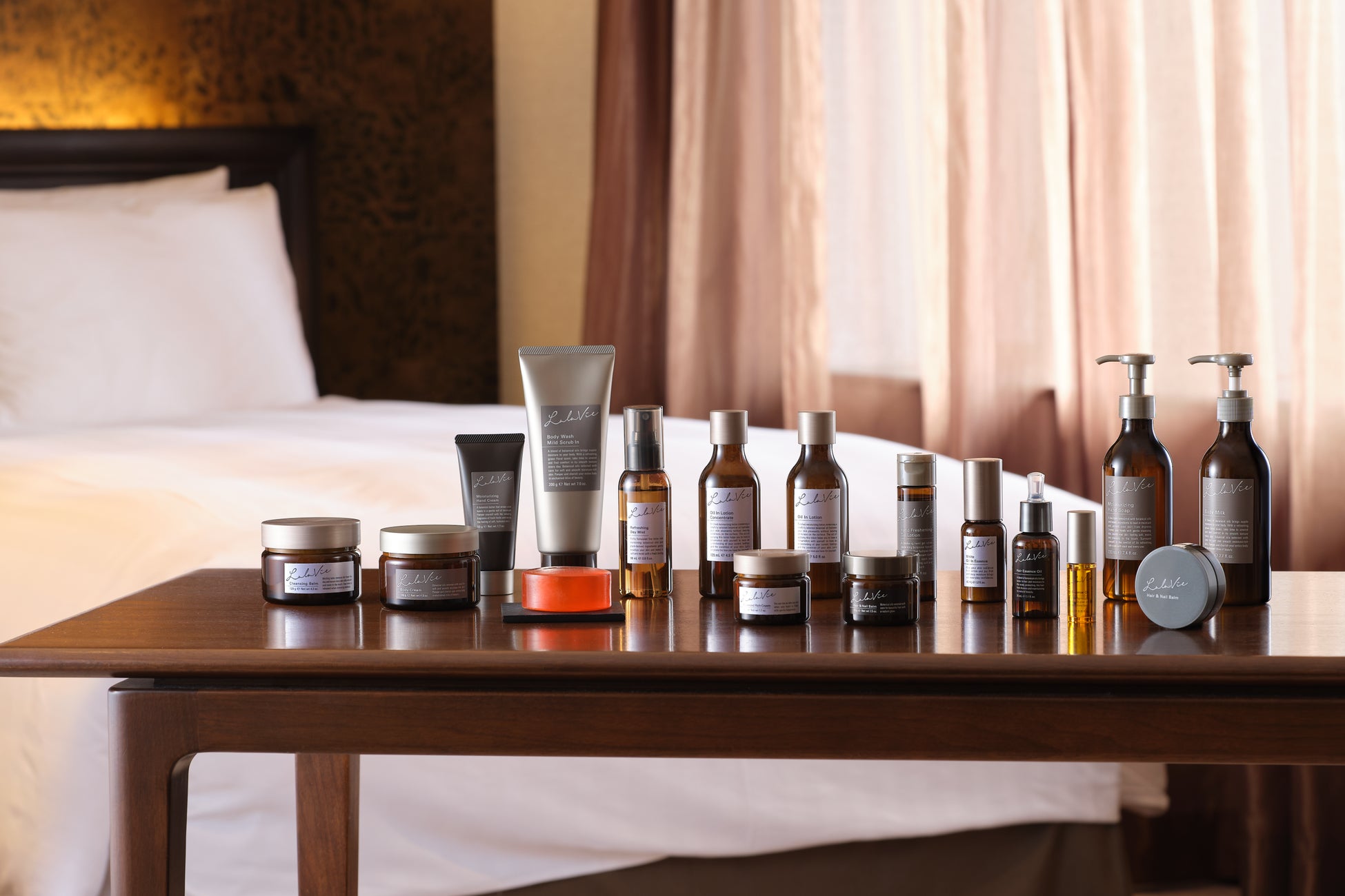 室内のアメニティは、ララヴィの看板商品であるオイルイン ローションをはじめ、すべてのアイテムを現品サイズでご用意。全品お持ち帰りいただける特別なプランです。