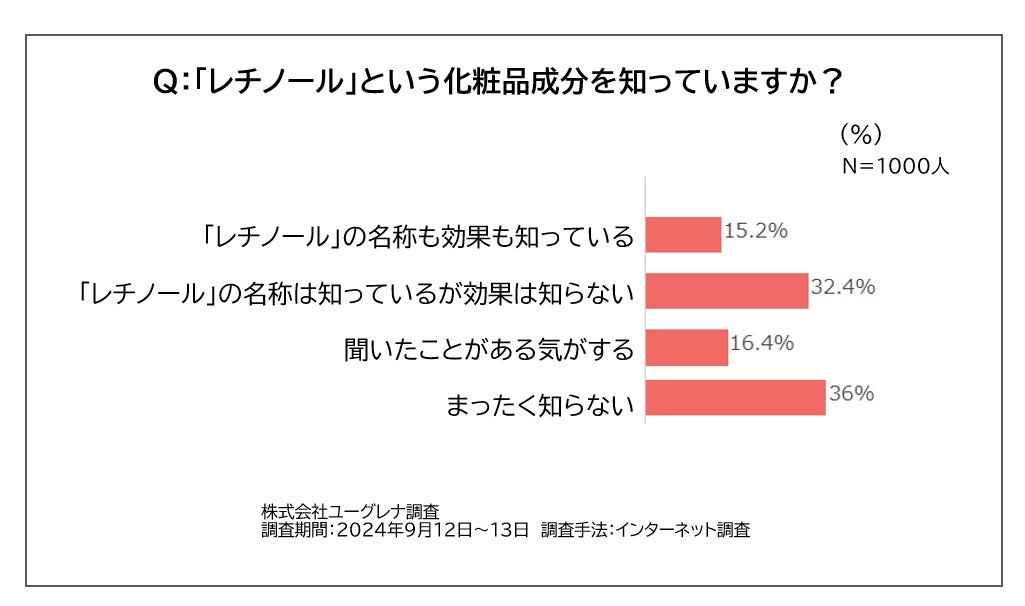 株式会社ユーグレナ(本社:東京都港区、代表取締役社長:出雲充)が全国の20代から70代の女性1000人に行ったインターネット調査によると、レチノールについて「まったく知らない」という人は36.0%と4割を切っており、6割以上の人がその名称は耳にしたことがあるようです。しかし、効果についても正しく認知している人はわずか15.2%にとどまります。