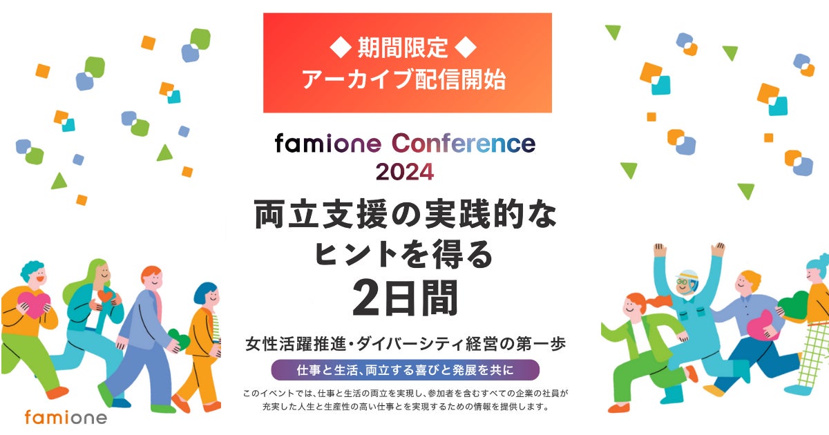 「子どもを願うすべての人によりそい 幸せな人生を歩める社会をつくる」をビジョンに掲げ、法人の従業員向け福利厚生や自治体の住民向け支援を行うヘルスケアサポートサービス「ファミワン」 https://famione.com/benefit/ などを展開する株式会社ファミワン(本社:東京都渋谷区、代表取締役:石川勇介)は、3回目の開催となる「ファミワンカンファレンス2024」を、「『両立支援の実践的なヒントを得る2日間』〜女性活躍推進・ダイバーシティ経営の第一歩〜」をテーマとし、2024年9月25日(水)26日(木)に開催いたしました。この度アーカイブ動画の配信を希望されるお声を多数頂戴し、アーカイブ配信を10月3日より2ヶ月限定で開始いたします。