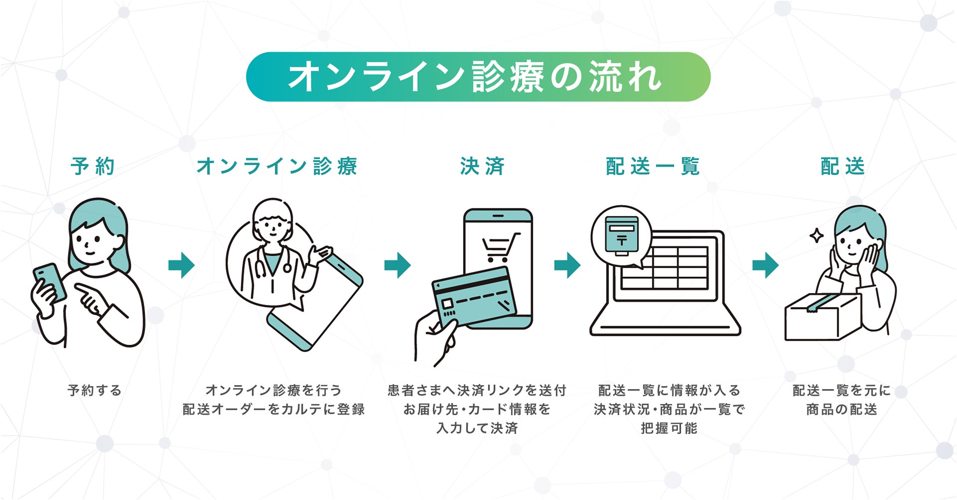 『オンライン診療機能』は、オンラインで診療から決済、商品の配送管理までできる機能です。これにより、患者の通院や待ち時間の負担を軽減することで時間が取れない患者の治療の継続に繋がるほか、遠方の患者への診療提供や定期的なフォローアップが容易にできるようになります。また、クリニックの運営コストの削減や競争力強化にもつながるなど、経営改善にも貢献が見込めます。