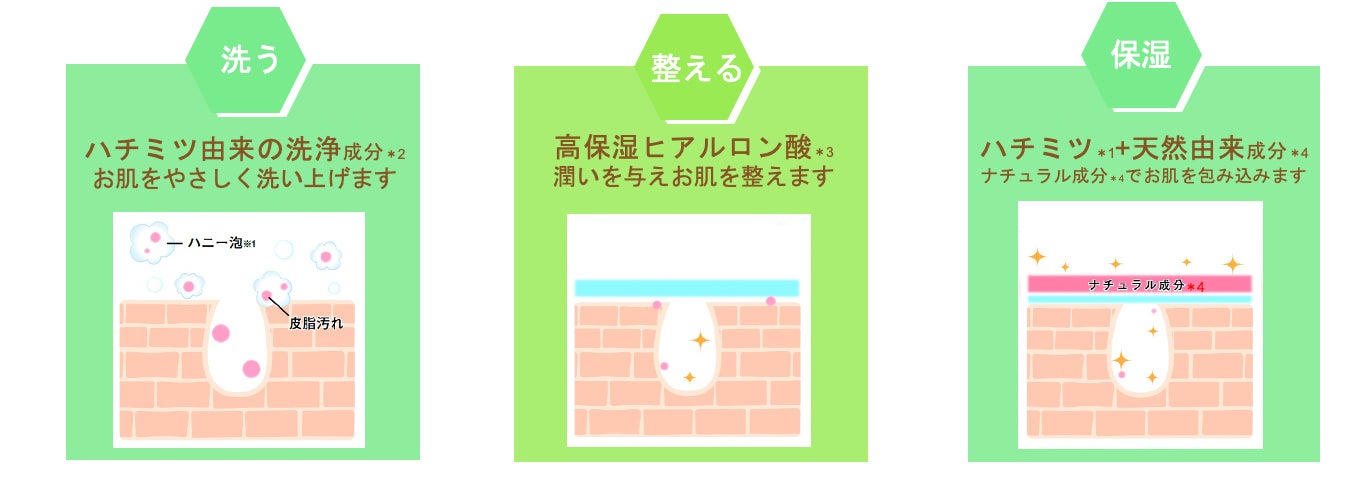 とろけるハニー泡※1でやさしく汚れを洗い落とす「ハチミツ由来の洗浄成分*2」、乾燥から肌を守る「高保湿ヒアルロン酸*3」、更に肌表面の潤いバランスを整える「ハチミツ*1+天然由来成分*4」の配合。低刺激性処方で肌を労わりながら洗い上げ、潤いながらもすべすべな仕上がりへ導く処方です。