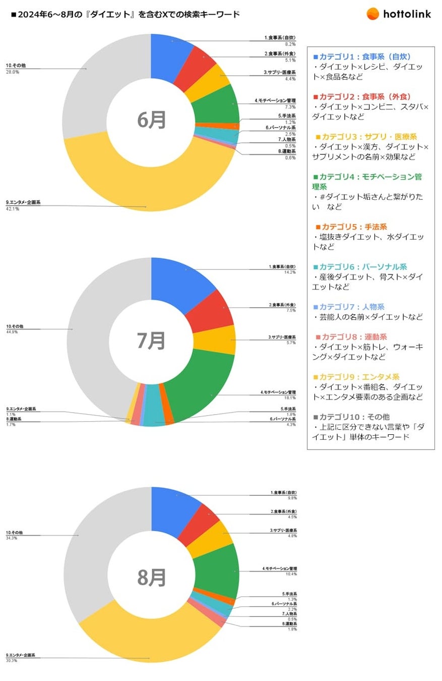2024年6月から8月の「ダイエット」を含む検索キーワードを抽出し、各月の上位100個のキーワードを以下の10のカテゴリに分類しました。そして、月ごとに各カテゴリの比率を調査しました。