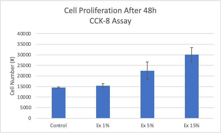 〇 FCJ-EX1 Type2*を1%、5%、15%の異なる濃度で、ヒト線維芽細胞に与え増殖経過を測定