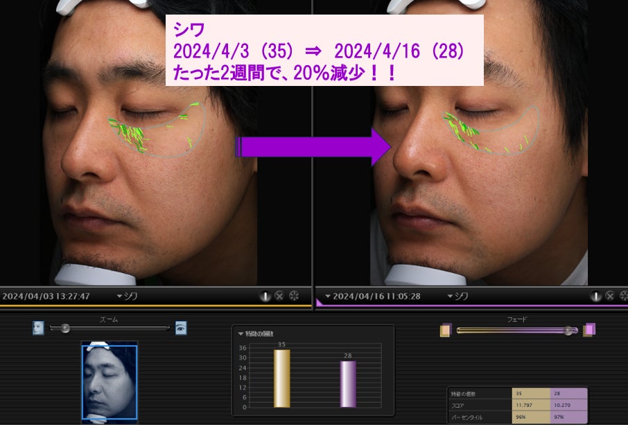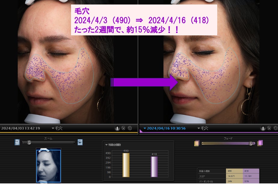 結果、顔のシワ、シミ、毛穴、きめ、ポルフィリンなどに対して効果が確認することができた。