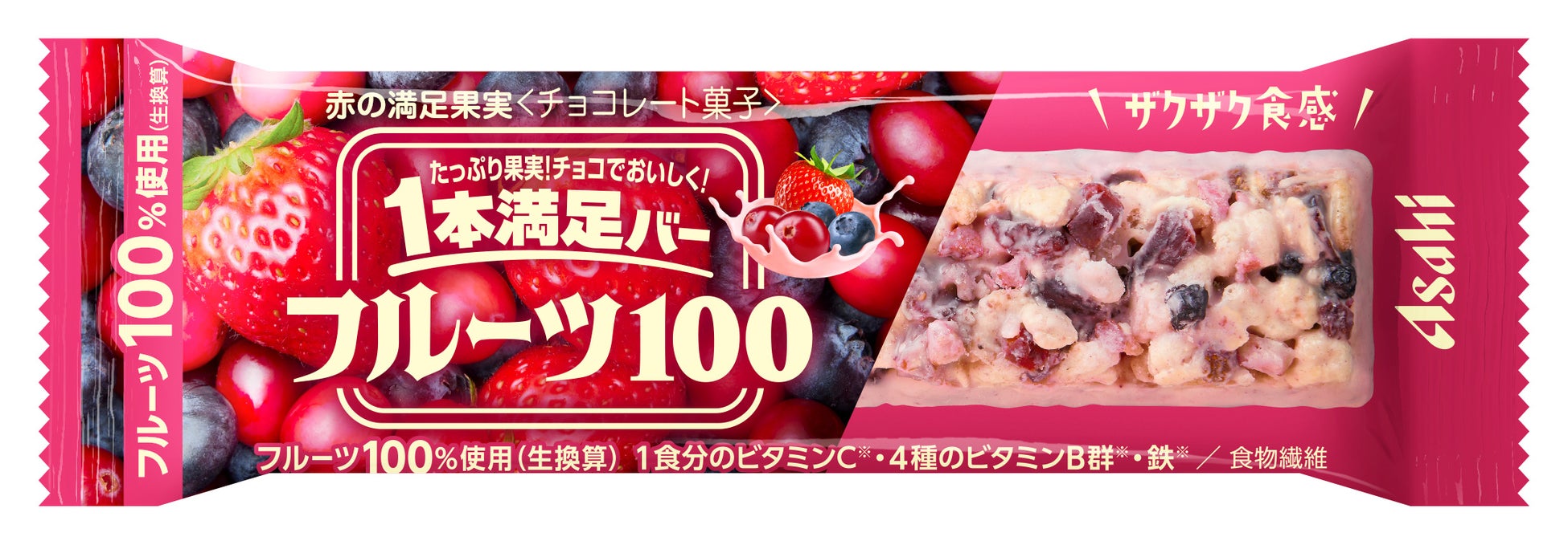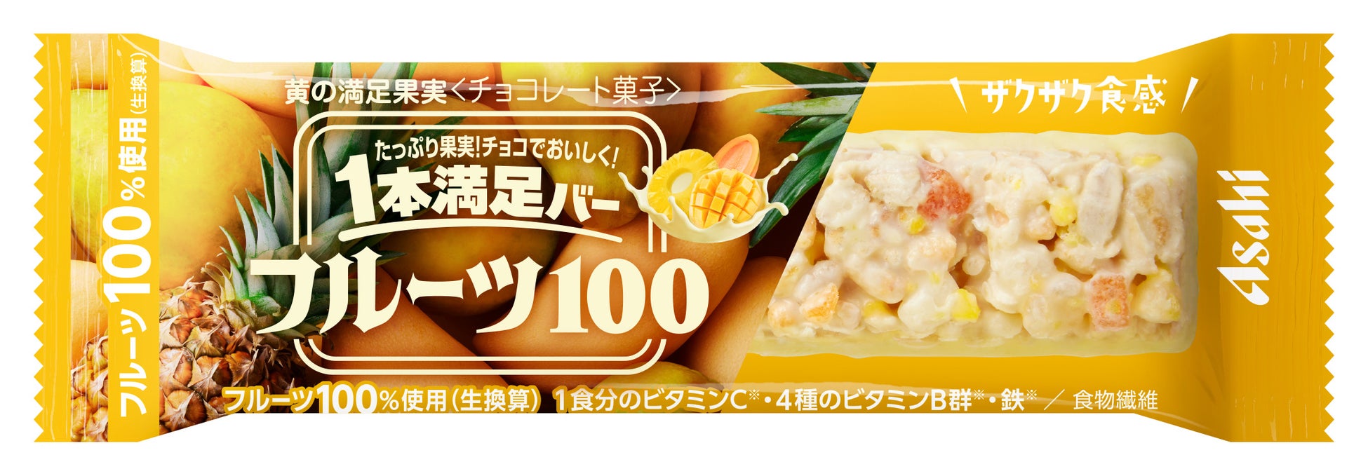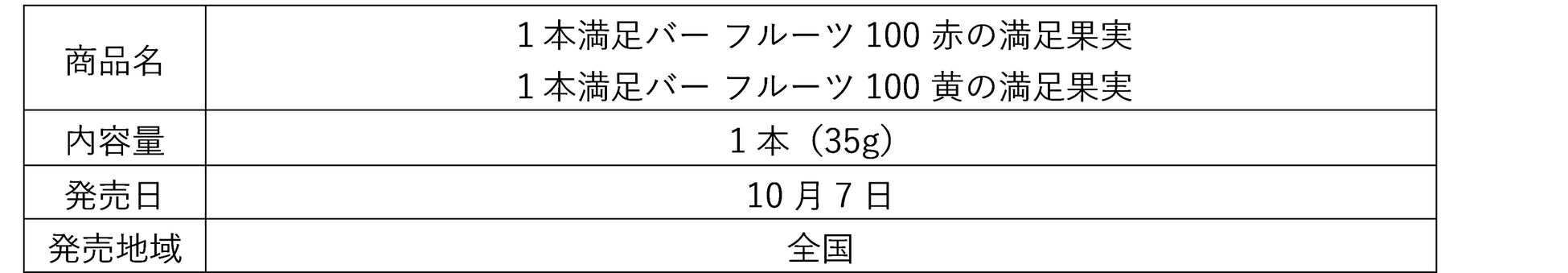 そこで、おいしさや健康的なイメージで食べられている果物を、より手軽にいつでもおいしくお楽しみいただくため、バータイプの「1本満足バー」の新シリーズとして、「1本満足バー フルーツ100」を開発しました。フルーツの配合量にこだわり、「赤の満足果実」、「黄の満足果実」ともに製品重量35gに対して、生換算でフルーツを35g以上配合しています。