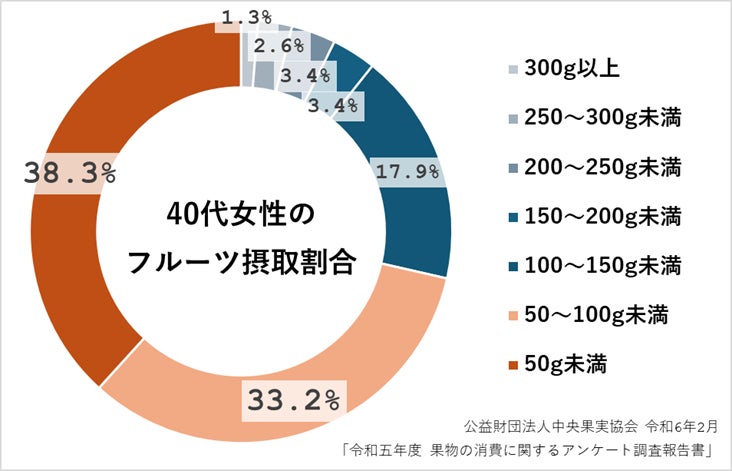 一方、厚生労働省が推奨する果物の摂取量※5は1日200gとされていますが、価格面や保存性、皮むきなど食べるまでの手間がかかることなどから、8割以上の人が目標摂取量を下回っています※4。例えば30代、40代の女性では、1日平均200g以上食べている人は、1割もありません。特に40代女性では1日100gも食べていない人が7割強と、他の世代に比べても高くなっています※4。