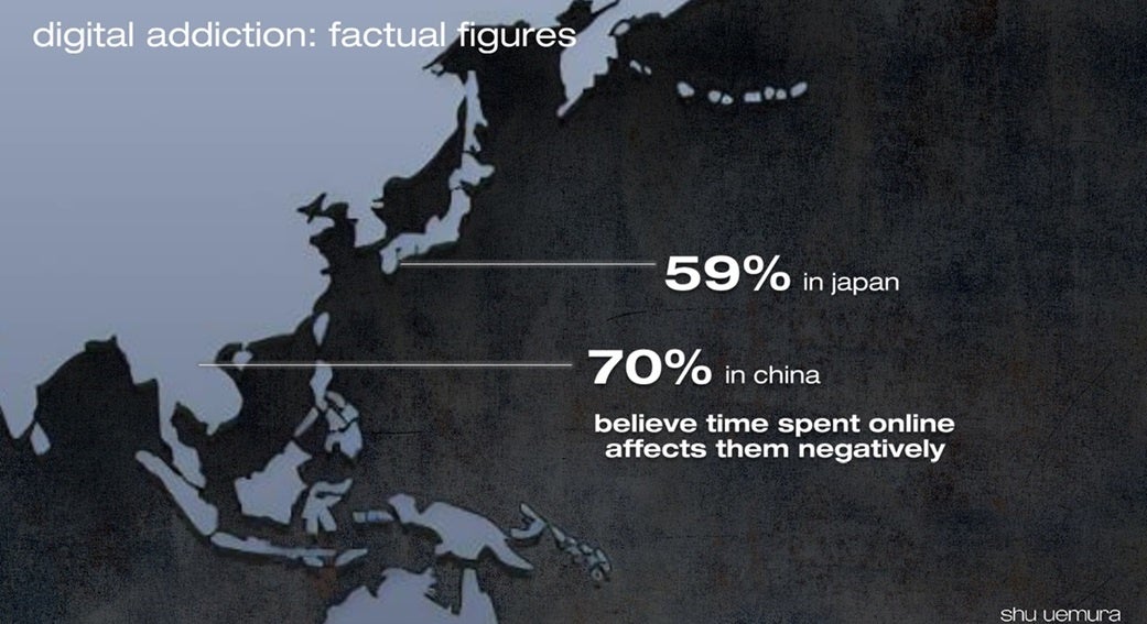 スピードの速いこのデジタル社会では、これまでになかったさまざまな社会問題が生じていますが、シュウ ウエムラはその中でもアジアの若者たちの心身の健康に影響を及ぼすデジタル依存症に対して懸念しています。デジタル依存症とは、デジタルメディアやデジタルデバイスに依存するあまり、社会生活や心身の健康に支障をきたしている状態を言います。デジタル依存症は脳の発達を阻害し、記憶力や注意力の低下を招くおそれがあります。体のリズムが崩れ、睡眠障害や頭痛の原因にもなります。家族や友人、仕事関係など、人との大切なつながりを害することもあります。