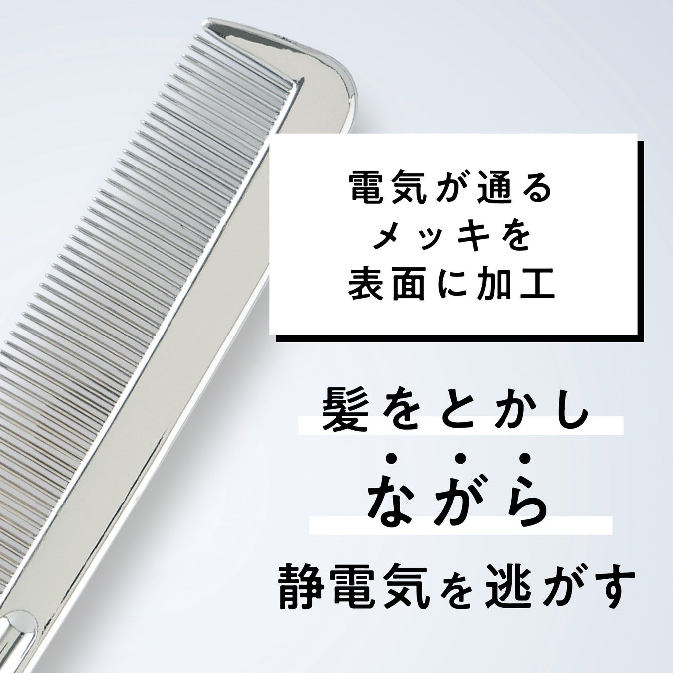 静電気を帯びた髪はもつれ・からみが発生しやすくなり、摩擦によってキューティクルが痛む可能性に繋がります。本商品は、表面にクロムメッキ加工を施すことで通電効果で髪の毛の静電気を流して逃します。