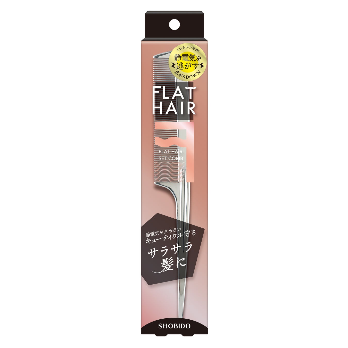 化粧品、化粧雑貨、服飾雑貨及びキャラクター雑貨等の企画・製造・販売、コンタクトレンズの企画・販売を行う粧美堂株式会社(本社:東京都港区、代表取締役社長:寺田正秀)は、クロムメッキ加工の通電効果で髪の毛の静電気を逃すブラシシリーズ「フラットヘア」から、前髪などの細かな部分のセットや分け目つけ・ブロッキング等に最適のセットコームを10月7日(月)より発売いたします。