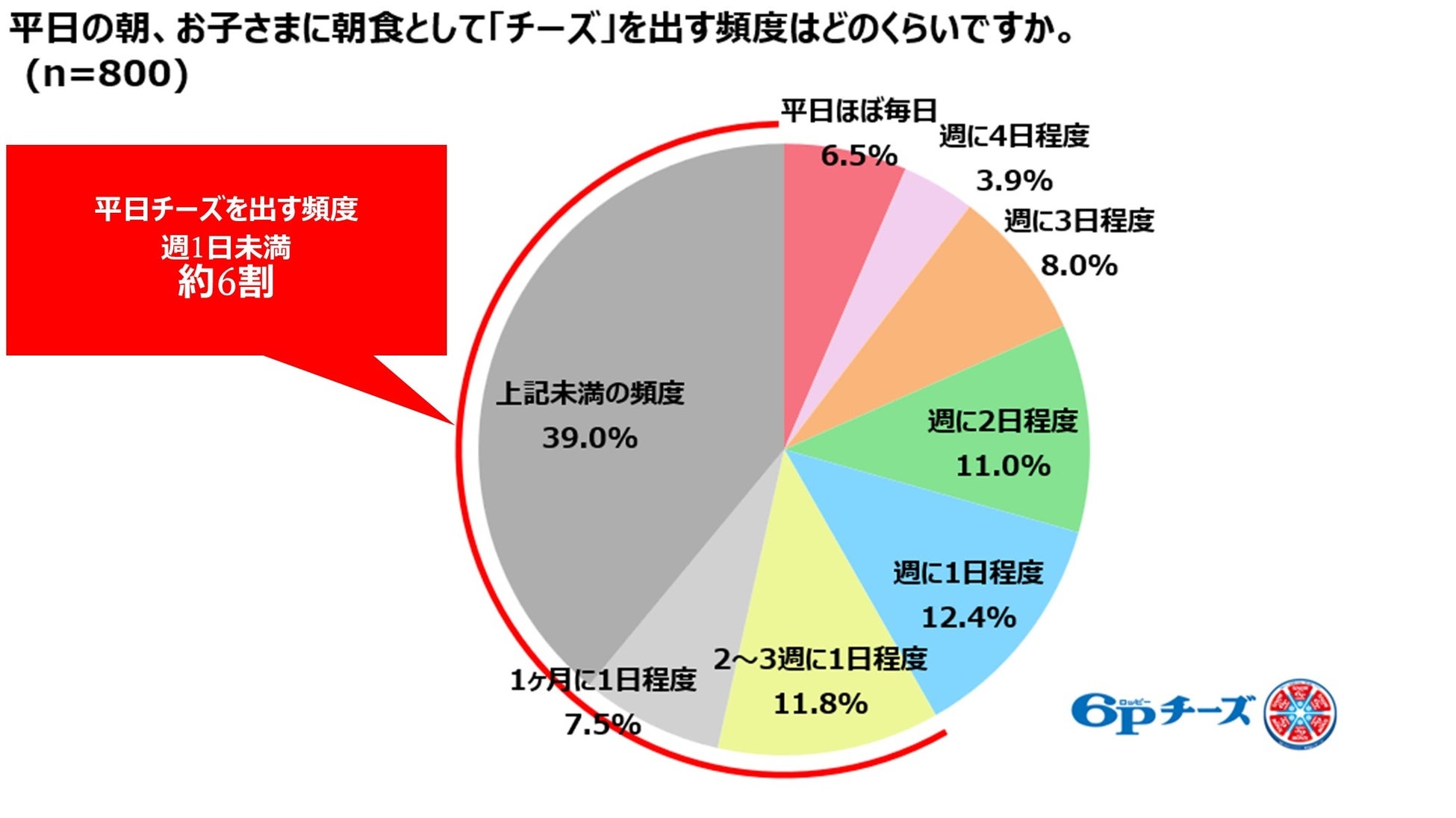 平日の朝、朝食にチーズを出す頻度について調査したところ、「2~3週に1回程度」(11.8%)、「1ヶ月に1回程度」(7.5%)、「それ以下の頻度」(39.0%)という結果となりました。