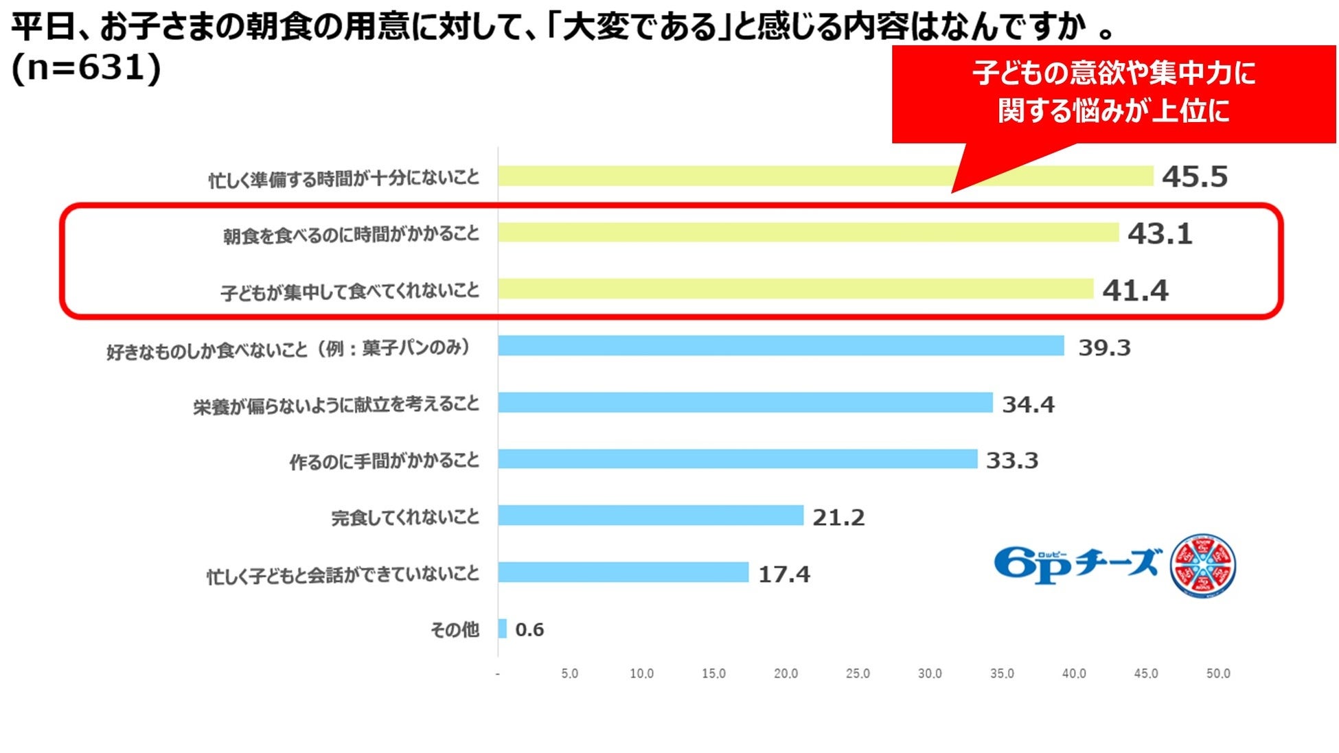 1位「忙しく準備する時間が十分にない」(45.5%)、2位「子どもが朝食を食べるのに時間がかかる」(43.1%)、3位「子どもが集中して食べてくれない」(41.4%)という結果になり、意欲や集中力に関する悩みが目立ちました。