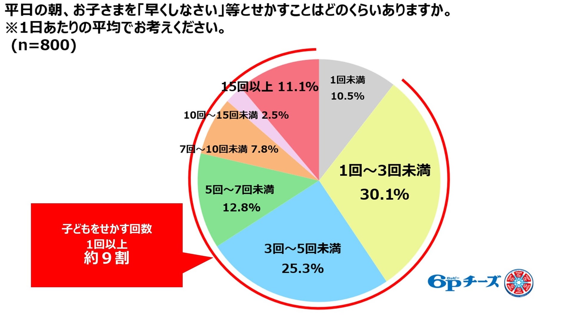 ▽平日の朝、9割の家庭が子どもを1回以上せかしており、1割が「早くしなさい」15回以上も