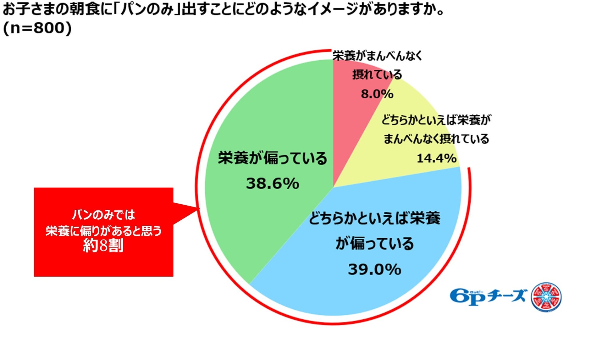 調査結果からは、「どちらかといえば栄養が偏っている」(39.0%)と「栄養が偏っている」(38.6%)を合わせると、全体の77.6%、約8割の方が「パンだけ」の朝食に栄養の偏りを感じていることがわかりました。