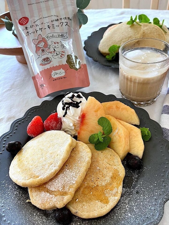 お客様から「メルヘンコーヒーのレシピを真似してみたけれど、うまく作れなかった」という声をいただいたことがきっかけです。お客様がご自宅でも簡単に美味しく作れる方法を模索し、約1年をかけてこのミックスを完成させました。卵や牛乳の代わりに、お豆腐や豆乳など、普段の冷蔵庫にある身近な材料を使って手軽に調理できるこのミックスは、ホットケーキやおやつだけでなく、砂糖不使用のためお好み焼きや天ぷらなどのおかずにも幅広く活用できます。