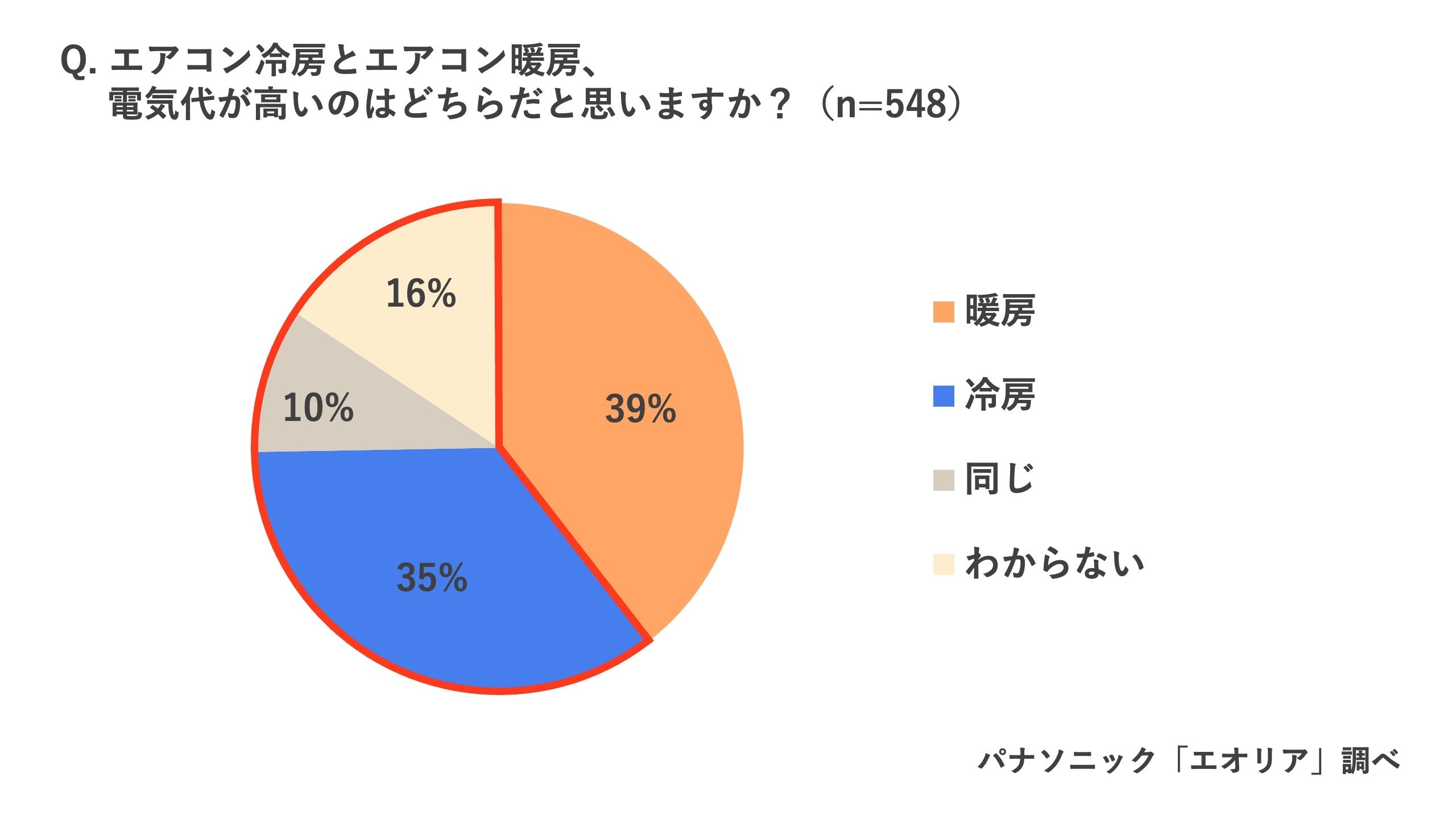 しかし、「エアコン冷房とエアコン暖房、電気代が高いのはどちらだと思いますか?」という質問では、「暖房」と正しく回答したのは39%で、61%は正しく理解していないことがわかりました。