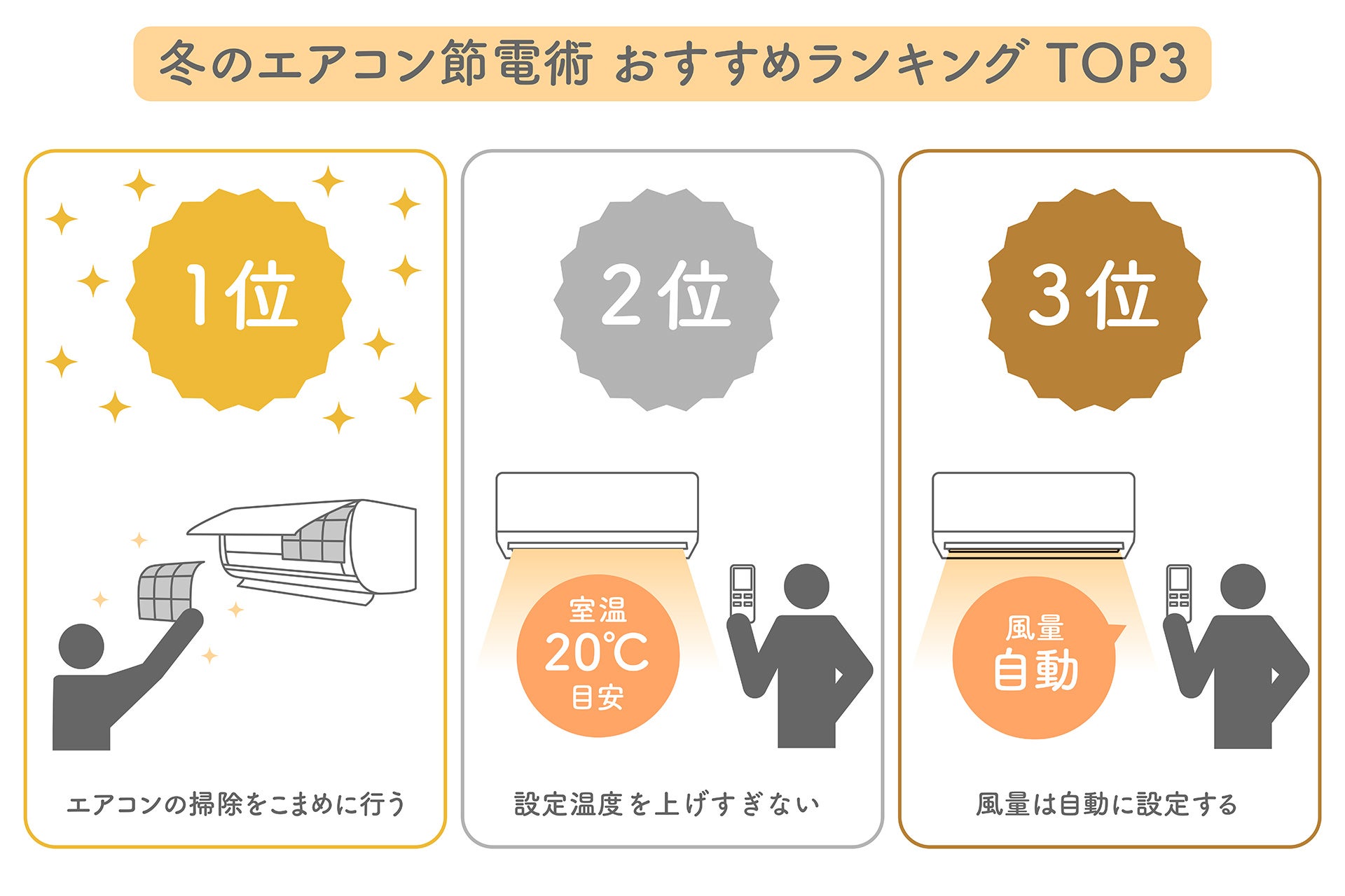 特に、「エアコンの掃除をこまめに行う」(1位)、「設定温度は上げすぎない」(2位)、「風量は自動に設定する」(3位)は、節電効果の高い冬のエアコン節電術なので、意識して実践してみましょう。