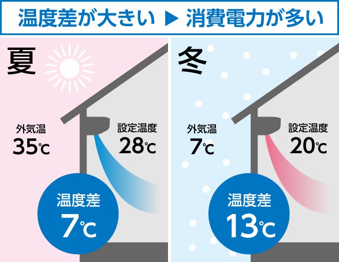 温度差が同じ場合でも、冷やすよりも暖めるほうが電力を消費するため、暖房運転のほうが消費電力が多くなり、電気代が高くなります。
