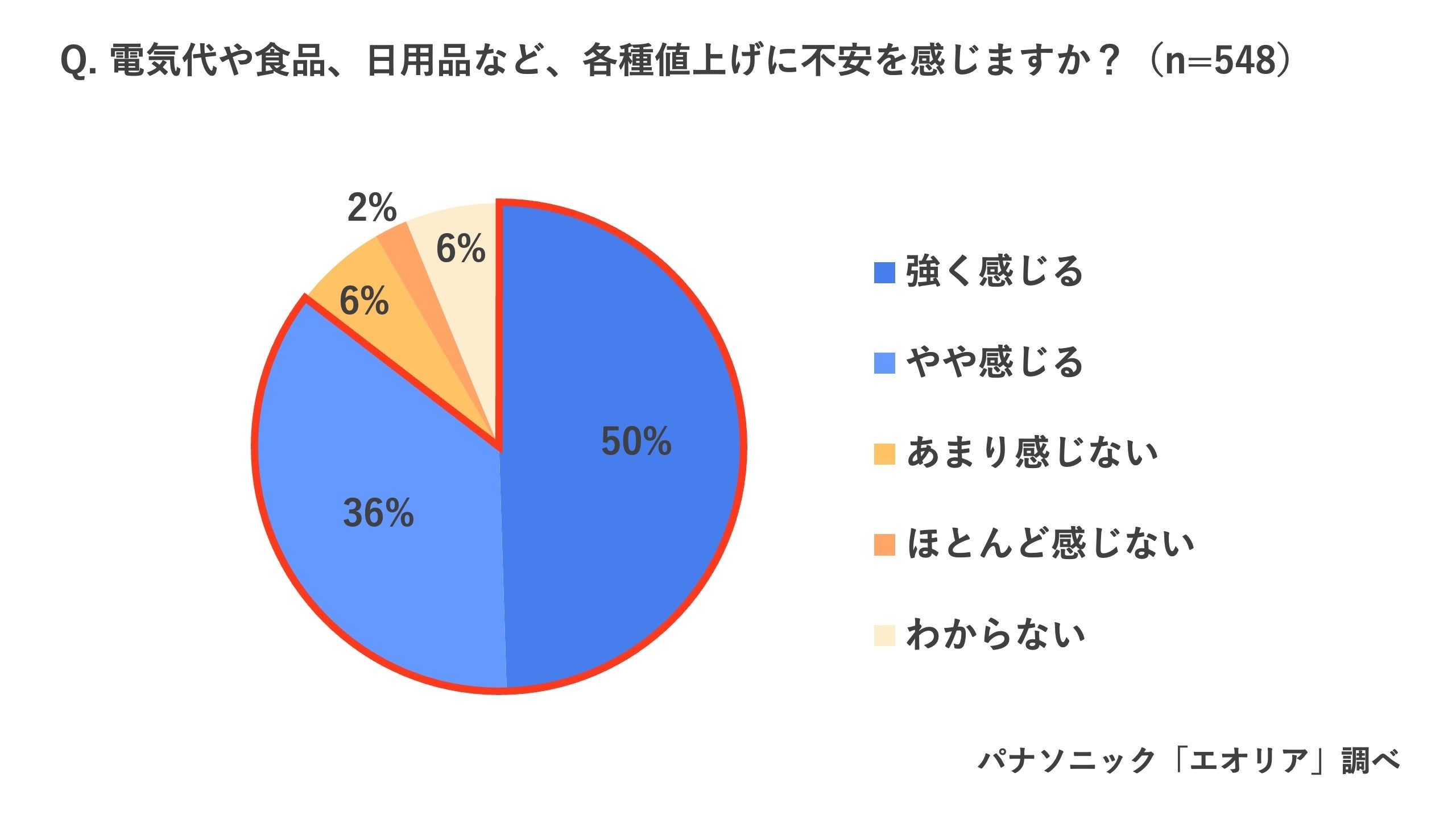 さらに、電気代に限らず食品、日用品など、各種値上げについての不安も、「強く感じる」50%、「やや感じる」36%と86%が不安を感じていることがわかりました。