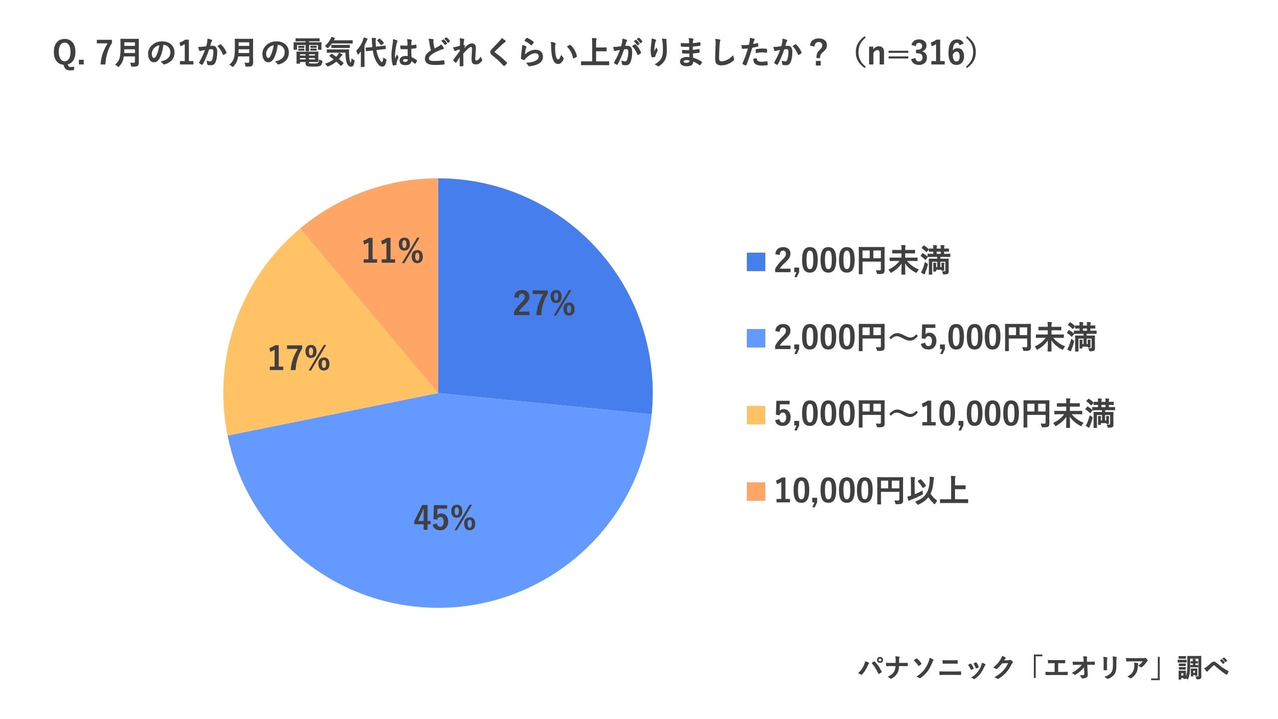記録的な暑さが続いた7月の増加額は、「2,000円〜5,000円未満」が最多の45%、「2,000円未満」27%、「5,000円〜10,000円未満」17%という順に。中には「10,000円以上」増加した方も11%と1割以上いる結果となりました。