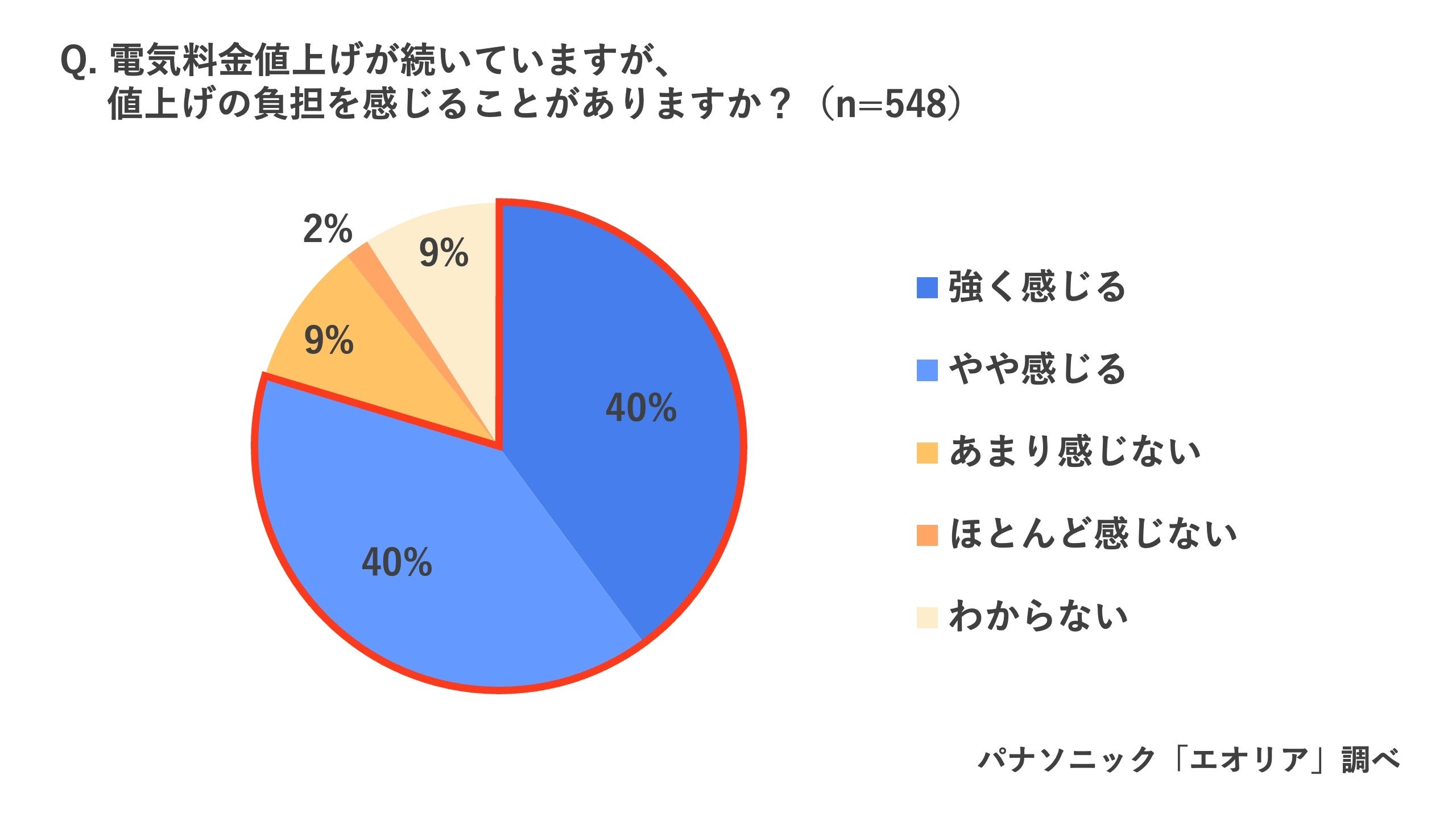 「電気料金値上げが続いていますが、値上げの負担を感じることがありますか?」という質問では、「強く感じる」40%、「やや感じる」40%と80%が負担を感じていることがわかりました。
