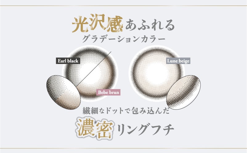瞳に光を与える光沢グラデーションカラーと繊細なドットが瞳を包む濃密リングフチで、