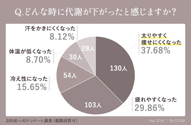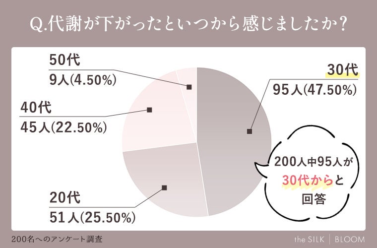 200名に「いつから代謝が落ちたと感じたか」を調査したところ、30代が最も多い結果となりました。