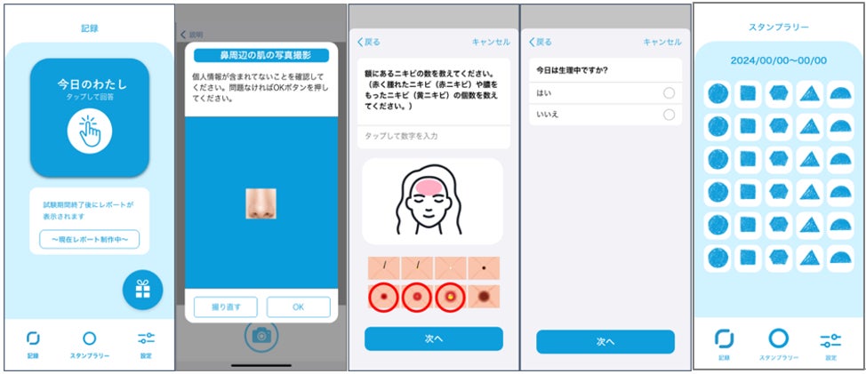 「大人のニキビ予防習慣研究所」は、毎日の生活習慣や体調を記録しやすいアンケート機能や、鼻周辺の肌写真の撮影機能、iPhone内蔵の加速度センサーを活用した睡眠時間の自動計測機能を搭載し、生活者の皆様にご協力いただくことで大人ニキビの発症と生活習慣などに関する情報を収集します。