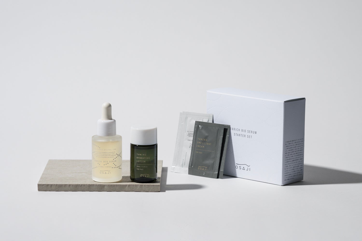 理想的な肌環境に整える「エンリッチバイオセラム」「エンリッチバイオオイル」に、角層に存在するうるおいを再現し、バリア機能をサポートする「チューニング ハイドレイティング ローション」とリッチなコクで肌にうるおいを定着させ、逃さない「チューニング エモリエント クリーム」をセットにしたOSAJIのスキンケアを初めてお使いいただく方におすすめの特別なアイテムです。