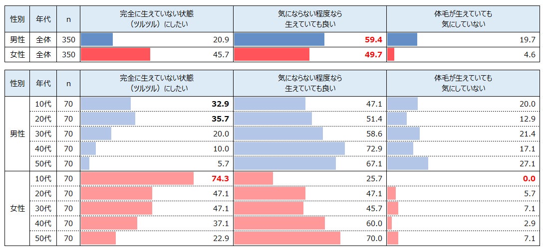 今回実施した「体毛に関する嗜好の調査」によると、体毛に対する考えとして男女共に「気にならない程度なら生えていても良い」という回答が最多でした。一方、10代女性では「完全に生えていない状態(ツルツル)にしたい」が74.3%と他世代に比べ多い結果となりました。また10代女性では「体毛が生えていても気にしていない」という回答が0でした。男女共に若年層の方が「完全に生えていない状態(ツルツル)」を望む傾向があります。