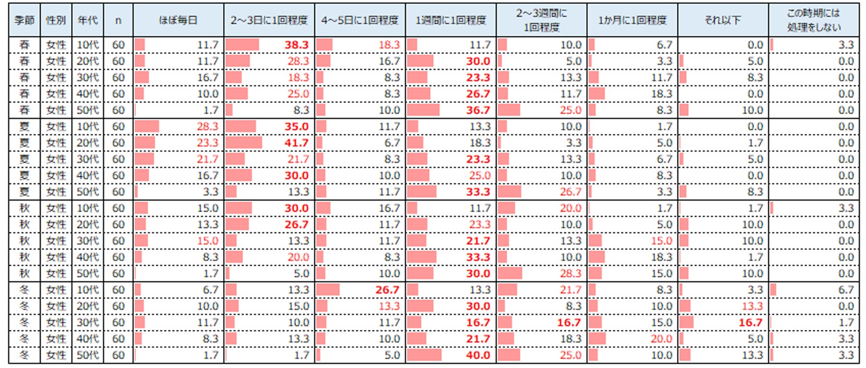 性別・世代別で比較すると、世代によりケア頻度の差があります。世代別に見ても男性は季節による差が小さい結果です。