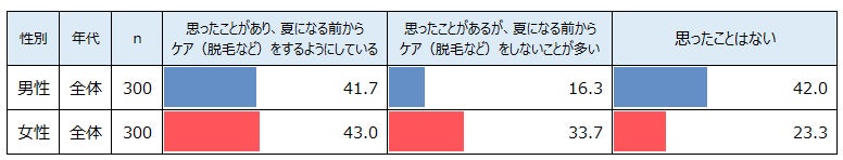 また、「夏になる前(暖かくなって薄着になる前)に体毛ケア(脱毛など)をしておけばよかった」と思ったことはありますか、という問いに対し、男性の58%・女性の76.7%が「思ったことがある」と回答しました。そう思った理由を自由回答で調査した結果、「急な温度変化」「温泉やサウナ」「周囲の視線」という意見が男女共通で挙がり、男性はハーフパンツを着る際に気になった、という意見もありました。女性からは、脱毛に時間がかかる、というような意見が男性より多く挙がりました。