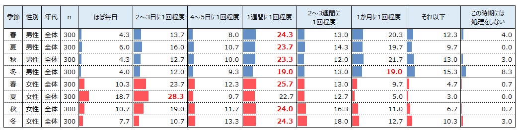 体毛ケア*¹を行う頻度を男女で比較すると、女性の方が季節に合わせて頻度を変える傾向がありました。世代を問わず性別全体で見ると、男性は季節を問わず「1週間に1回程度」の体毛ケア頻度がトップでした。女性は春秋冬で「1週間に1回程度」のケア頻度がトップです。