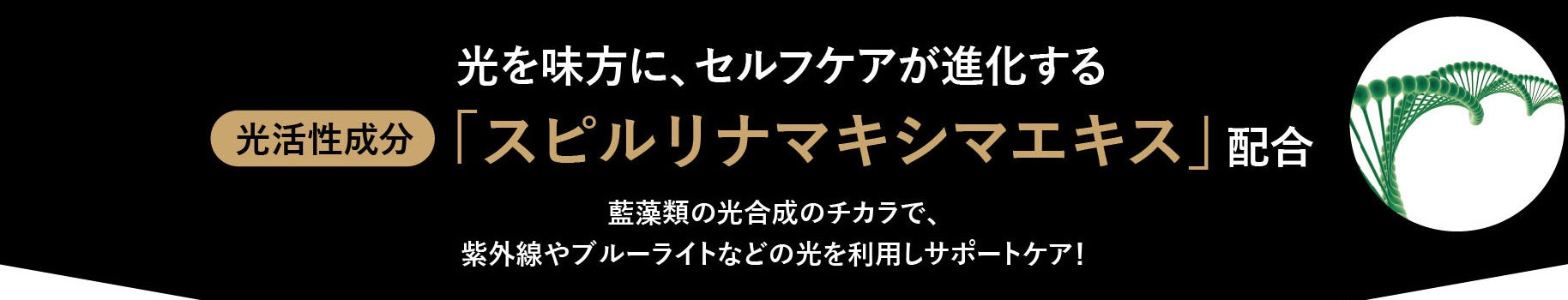 光活性成分「スピルリナマキシマエキス」の他に、商品によってライ麦の強靭な特性に着目した「ライムギ種子エキス」や、藻類から抽出される希少な成分「ペンタデシル®」を配合しております。