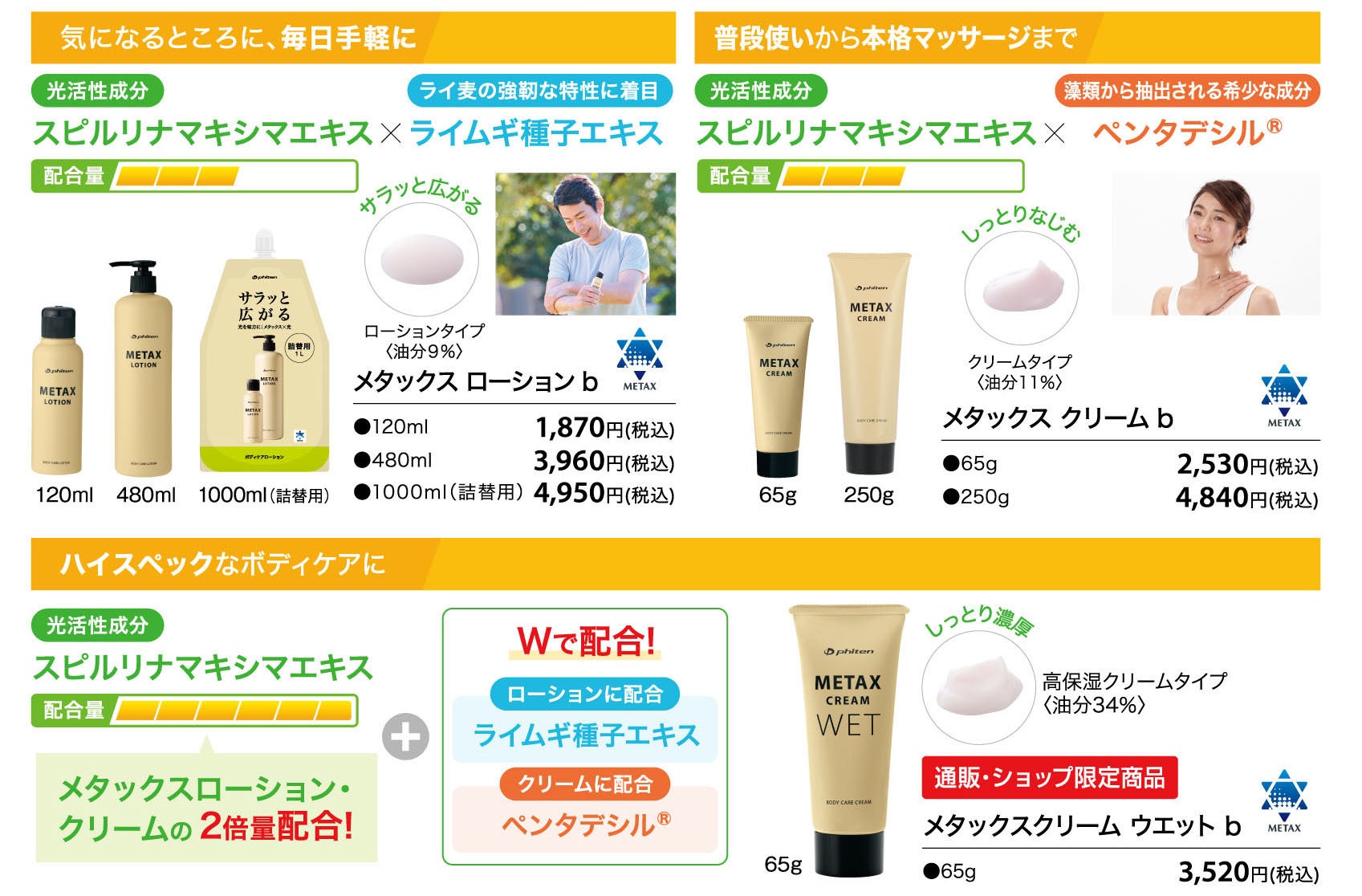 ファイテンの塗るボディケアシリーズは、ファイテン独自の技術「メタックス」を採用した全身ケアアイテムです。メタックスとは、ファイテンの水溶化メタル技術により、各種金属をナノレベルで水中に分散したもので、この技術を用いた商品を身に着けることで、カラダをリラックス状態へとサポートします。さらに、今回のリニューアルでは、光を味方にする「スピルリナマキシマエキス」を3商品すべてに配合しており、紫外線やブルーライトなどの光を利用してサポートケアできるようになっております。