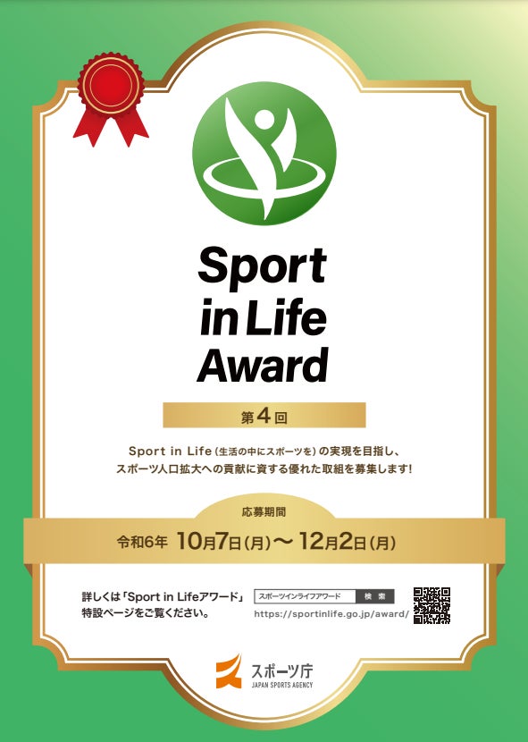 スポーツ庁では、一人でも多くの方がスポーツに親しむ社会の実現のため、「Sport in Lifeプロジェクト」として、スポーツ人口拡大への貢献に資する優れた取組を募集し、「Sport in Lifeアワード」として表彰しております。本アワードで受賞された取組を、広く社会に発信することで、より多くの国民のスポーツ参加の機会を創出し、Sport in Life(=毎日の生活の中にスポーツを)の実現を目指します。今年度で4回目の開催になるところ、皆様のご応募をお待ちしております。