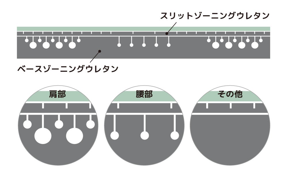 ウレタン二層がゾーニング構造になっており、肩部を柔らかくすることで、肩が自然に入り込み、横寝がしやすい構造になっています。また、最も荷重がかかる腰部を硬くすることで、落ち込みを防ぎ、寝返りもサポートします。