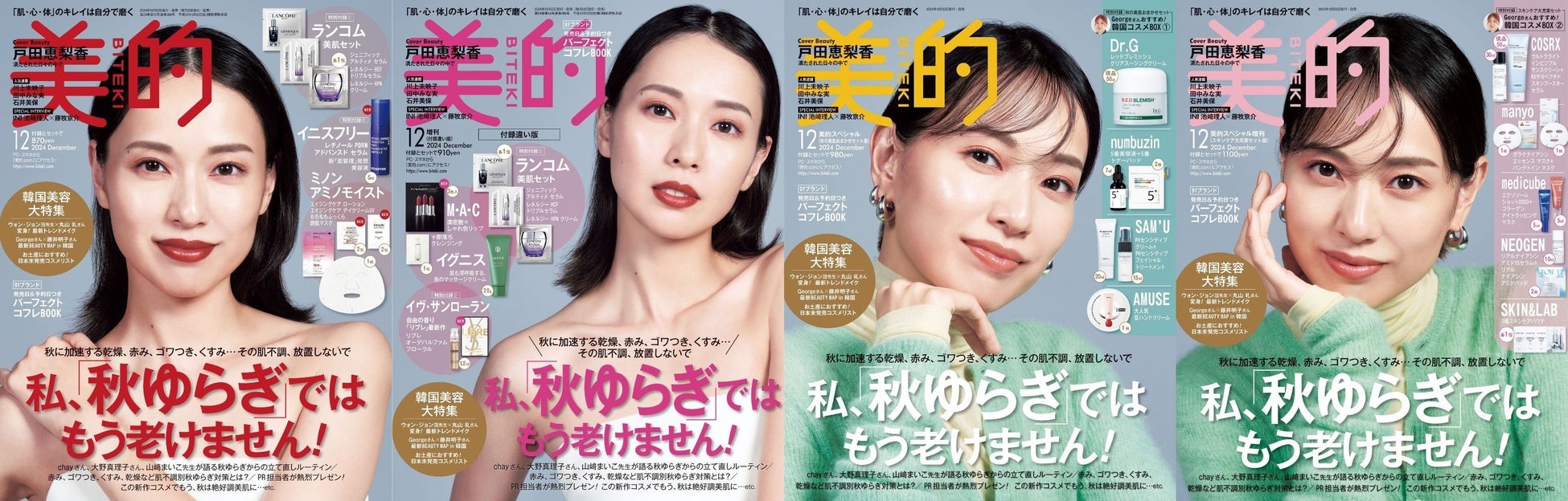 戸田恵梨香さんが、『美的』12月号に登場! 同時発売の通常版、付録違い版、秋の美肌おまかせセット版、スキンケア大充実セット版の4パターン表紙をジャックしています!