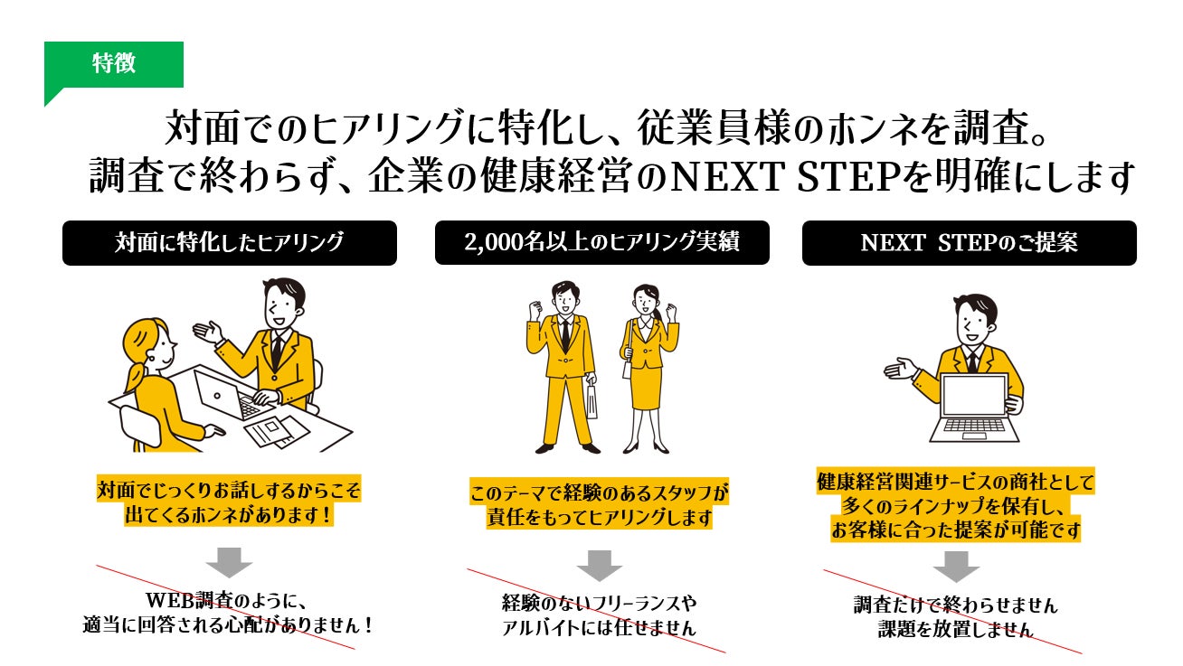 ウェルネスサーベイでは、健康経営に取り組む企業様のNEXT STEPを導く、対面特化のサーベイになります。従業員様に直接インタビューすることで、普段会社には話せないホンネに迫ります。