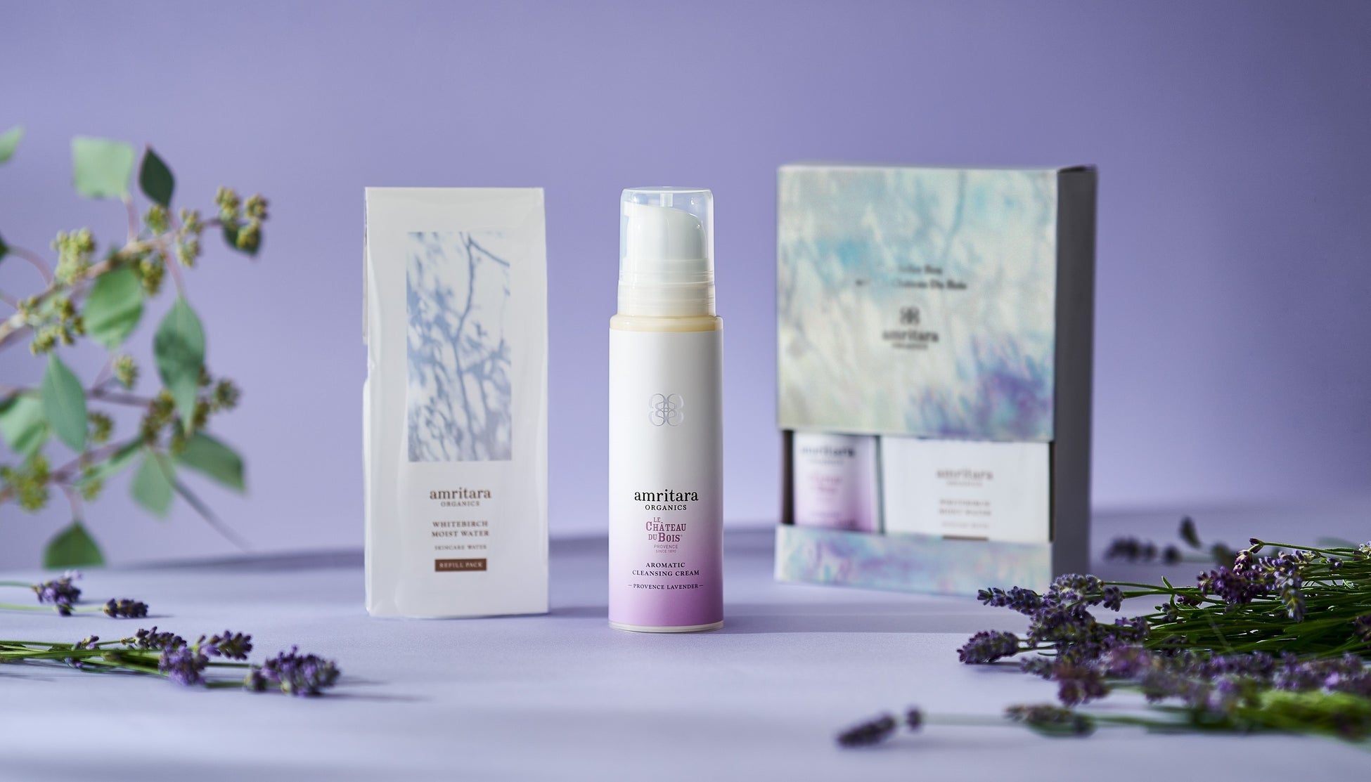 アムリターラを代表する「アロマティック クレンジング クリーム」に、シャトー·デュ·ボワのトゥルーラベンダーの精油を配合。ひときわ華やかで芳醇なラベンダーの香りをお楽しみいただけます。